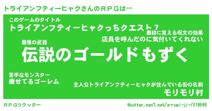 | 男性向けラノベタイトル風あだ名 | 『トライアンフティーヒャクの憂鬱』 |