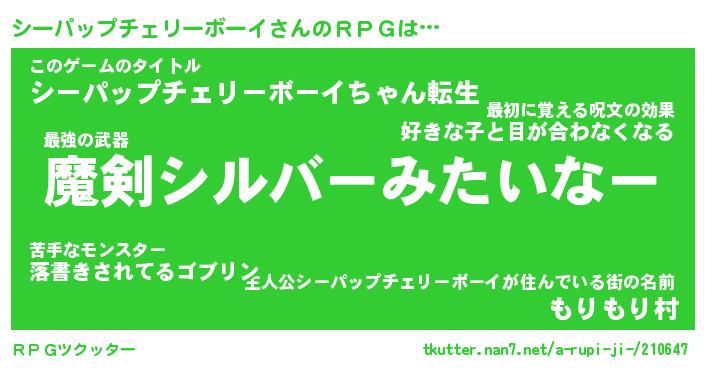 | 男性向けラノベタイトル風あだ名 | 『シーパップチェリーボーイの憂鬱』 |
