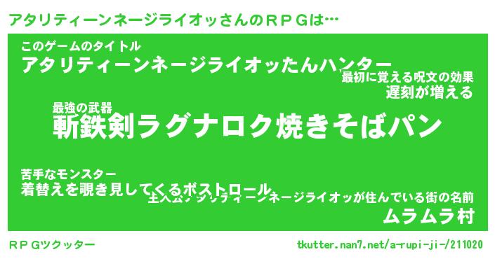 | ヒーロー風カッコイイあだ名 | 『スーパーアタリティーンネージライオッ』 |