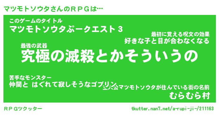 | 胡散臭い通販商品みたいなあだ名 | 『モテモテ間違いなし霊験あらたかなお札…その名も「マツモトソウタ」』 |