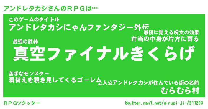 | 男性向けラノベタイトル風あだ名 | 『アンドレタカシアートオンライン』 |