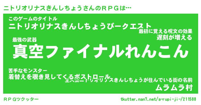 | 肩書あだ名 | 『ニトリオリナスきんしちょうCEO』 |