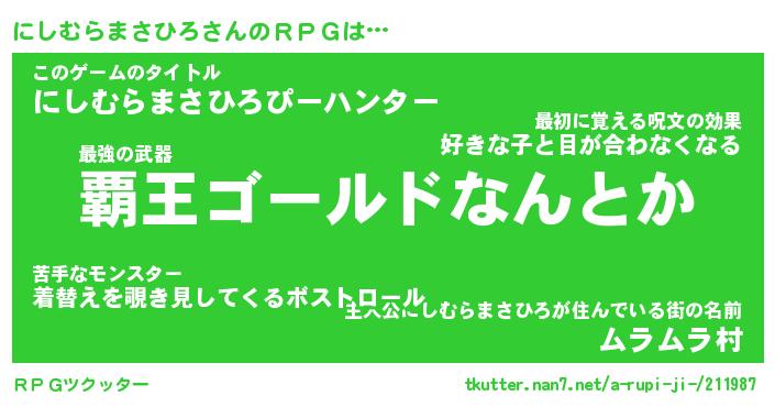 | 伝説のあだ名 | 『封印されし傭兵にしむらまさひろ』 |