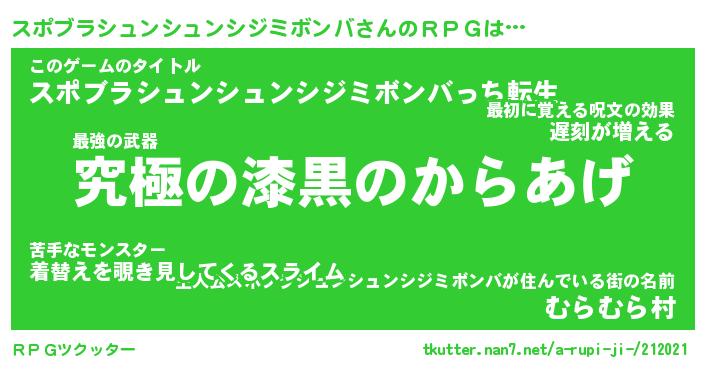 | 男性向けラノベタイトル風あだ名 | 『スポブラシュンシュンシジミボンバアートオンライン』 |