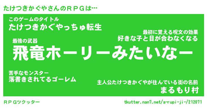 | 男性向けラノベタイトル風あだ名 | 『タケツキカグヤアートオンライン』 |