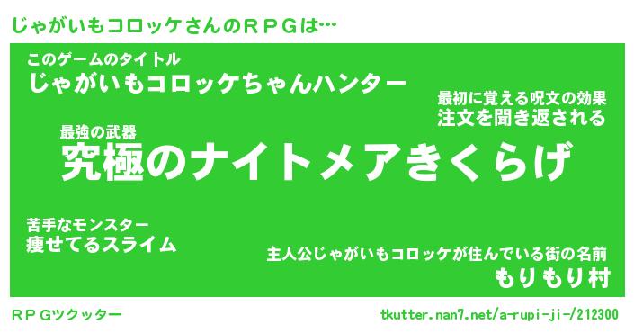 | 男性向けラノベタイトル風あだ名 | 『じゃがいもコロッケの憂鬱』 |