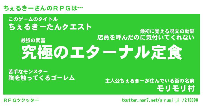 | 男性向けラノベタイトル風あだ名 | 『ちぇるきーの憂鬱』 |