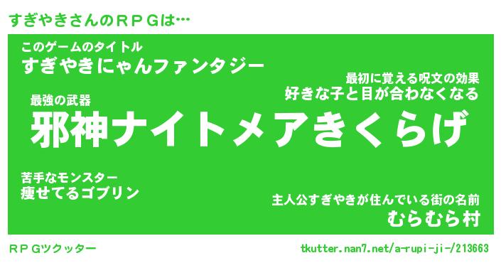 | ファンタジー風あだ名 | 『スギフェル』『エターナルスギヤキー』 |
