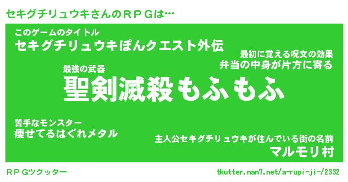 | 男性向けラノベタイトル風あだ名 | 『セキグチリュウキの憂鬱』 |