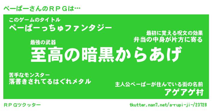 | 料理風あだ名 | 『節約★ぺーぱーと油揚げの玉子丼』 |