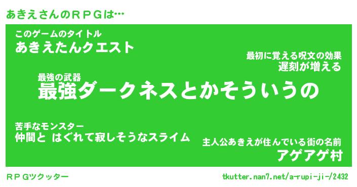 | 男性向けラノベタイトル風あだ名 | 『アキエアートオンライン』 |