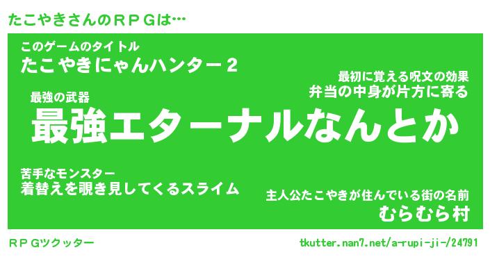 | ファンタジー風あだ名 | 『タコフェル』『エターナルタコヤキー』 |