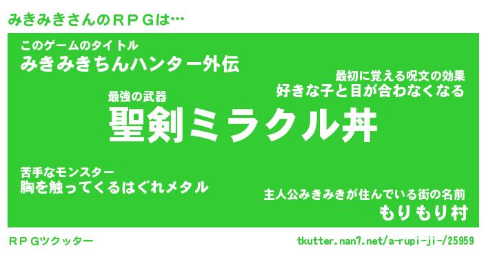 | 男性向けラノベタイトル風あだ名 | 『みきみきの憂鬱』 |