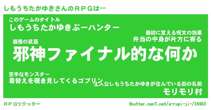 | 男性向けラノベタイトル風あだ名 | 『シモウチタカユキアートオンライン』 |