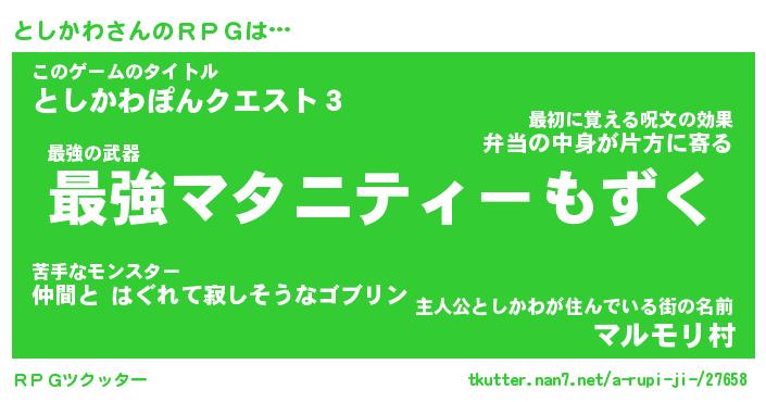 | 男性向けラノベタイトル風あだ名 | 『トシカワアートオンライン』 |