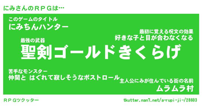 | 男性向けラノベタイトル風あだ名 | 『にみの憂鬱』『ノーゲーム・ノーニミ』 |