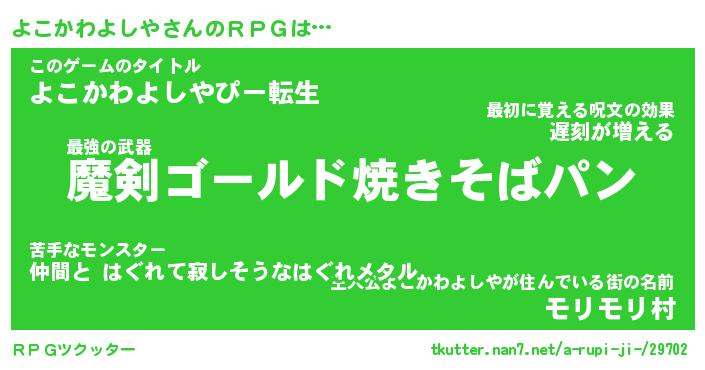 | 男性向けラノベタイトル風あだ名 | 『よこかわよしやの憂鬱』 |