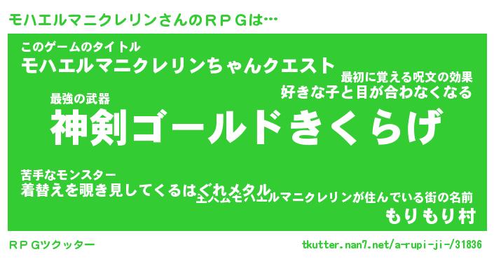 | 男性向けラノベタイトル風あだ名 | 『モハエルマニクレリンの憂鬱』 |