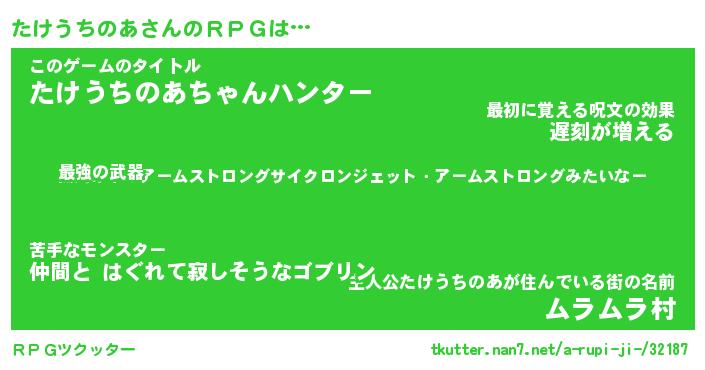 | 男性向けラノベタイトル風あだ名 | 『タケウチノアアートオンライン』 |