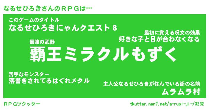 | 男性向けラノベタイトル風あだ名 | 『ナルセヒロキアートオンライン』 |