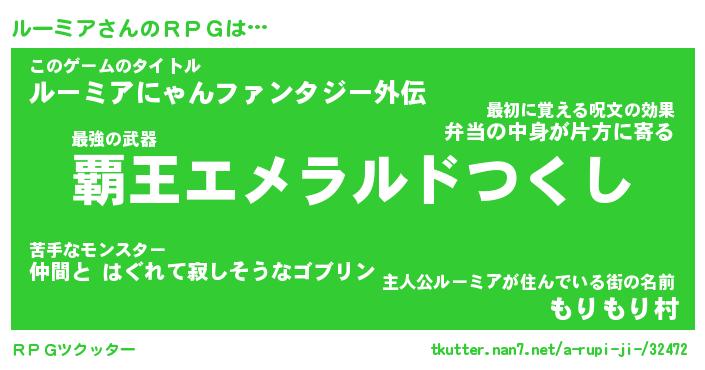 | 男性向けラノベタイトル風あだ名 | 『ルーミアアートオンライン』 |