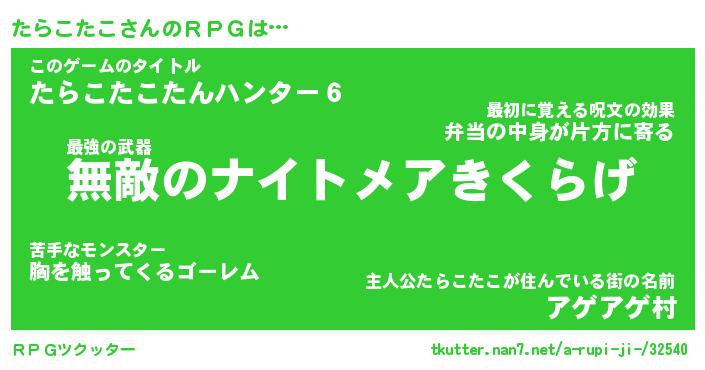 | ヒーロー風カッコイイあだ名 | 『スーパータラコタコ』『黄金騎士タラ』 |