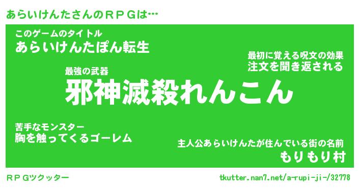 | 男性向けラノベタイトル風あだ名 | 『アライケンタアートオンライン』 |