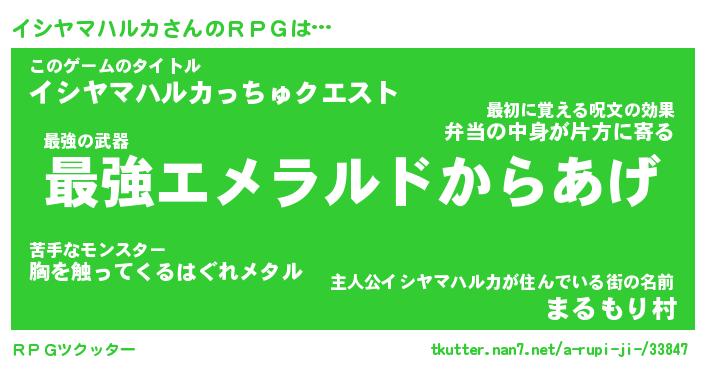 | 胡散臭い通販商品みたいなあだ名 | 『モテモテ間違いなし霊験あらたかなお札…その名も「イシヤマハルカ」』 |