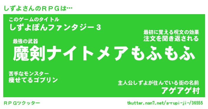 | ファンタジー風あだ名 | 『シズフェル』『エターナルシズヨー』 |