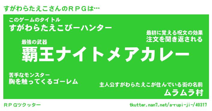 | 男性向けラノベタイトル風あだ名 | 『スガワラタエコアートオンライン』 |