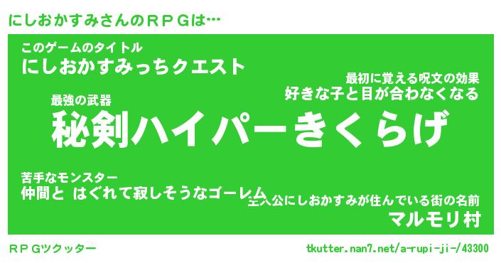 | 男性向けラノベタイトル風あだ名 | 『にしおかすみの憂鬱』 |