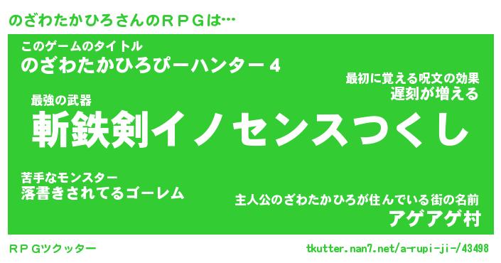 | 男性向けラノベタイトル風あだ名 | 『のざわたかひろの憂鬱』 |