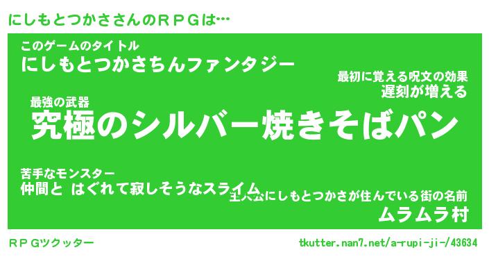 | 男性向けラノベタイトル風あだ名 | 『ニシモトツカサアートオンライン』 |