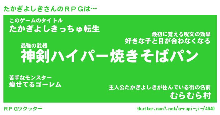 | 男性向けラノベタイトル風あだ名 | 『たかぎよしきの憂鬱』 |