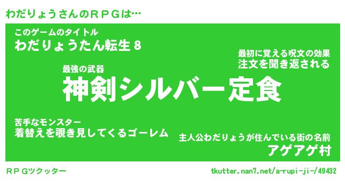 | 男性向けラノベタイトル風あだ名 | 『わだりょうの憂鬱』 |