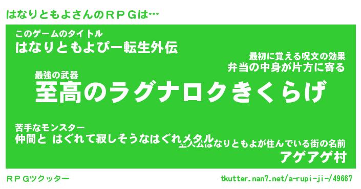 | 男性向けラノベタイトル風あだ名 | 『ハナリトモヨアートオンライン』 |
