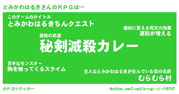 | 男性向けラノベタイトル風あだ名 | 『とみかわはるきの憂鬱』 |