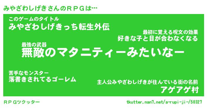 | 男性向けラノベタイトル風あだ名 | 『ミヤザワシゲキアートオンライン』 |
