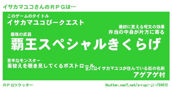 | 男性向けラノベタイトル風あだ名 | 『イサカマユコアートオンライン』 |