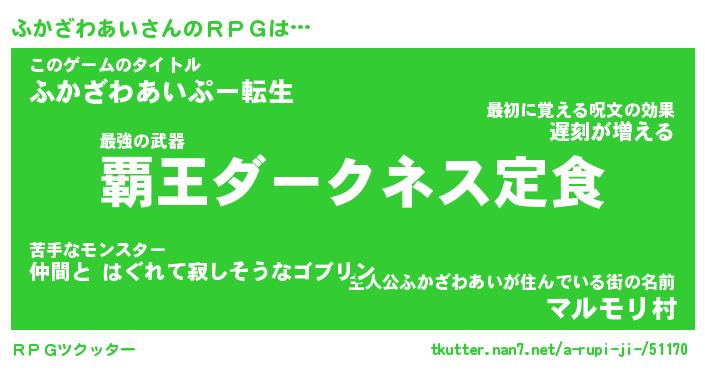 | 男性向けラノベタイトル風あだ名 | 『フカザワアイアートオンライン』 |