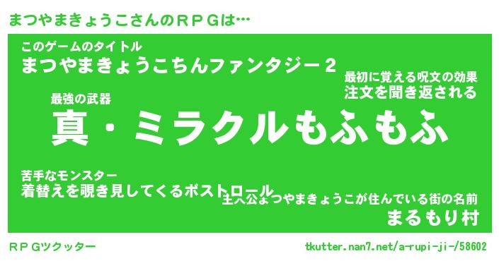 | 伝説のあだ名 | 『封印されし竜騎士まつやまきょうこ』 |