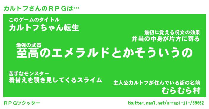 | 男性向けラノベタイトル風あだ名 | 『カルトフアートオンライン』 |