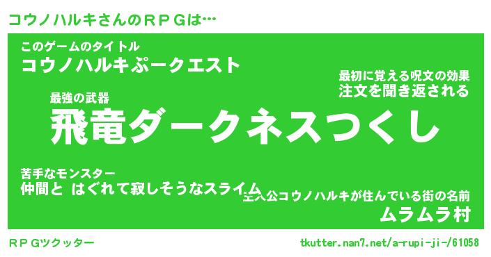 | 伝説のあだ名 | 『封印されし傭兵コウノハルキ』 |