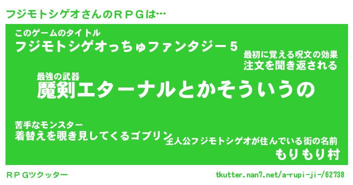 | 男性向けラノベタイトル風あだ名 | 『フジモトシゲオの憂鬱』 |