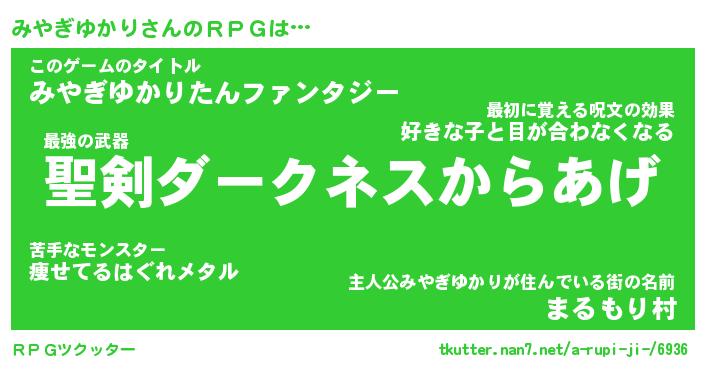 | ヒーロー風カッコイイあだ名 | 『スーパーミヤギユカリ』『黄金騎士ミヤ』 |