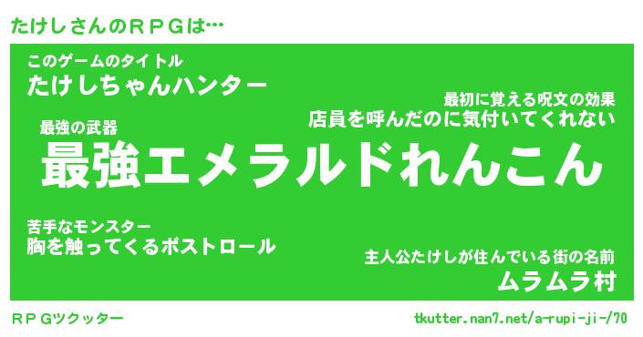 | ファンタジー風あだ名 | 『タケフェル』『エターナルタケシー』 |