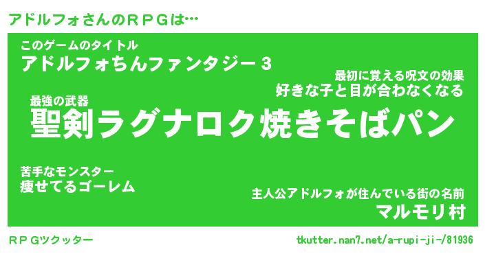 | ファンタジー風あだ名 | 『アドフェル』『エターナルアドルフォー』 |