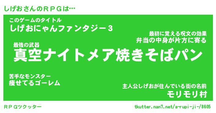 | 男性向けラノベタイトル風あだ名 | 『シゲオアートオンライン』 |