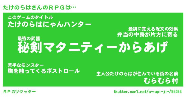 | 男性向けラノベタイトル風あだ名 | 『たけのらはの憂鬱』 |