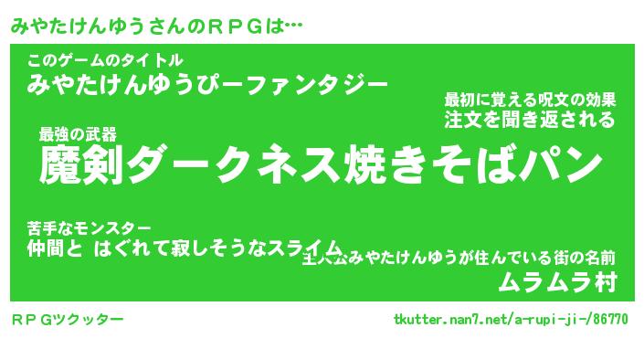 | 男性向けラノベタイトル風あだ名 | 『みやたけんゆうの憂鬱』 |